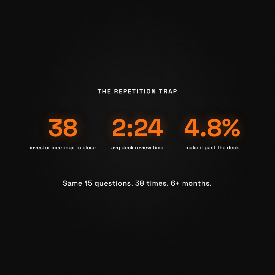 The average seed founder spends six or more months fundraising, repeating the same answers across 15 to 20 investor meetings (Crunchbase 2025). That is not a fundraising process. That is a repetition trap.