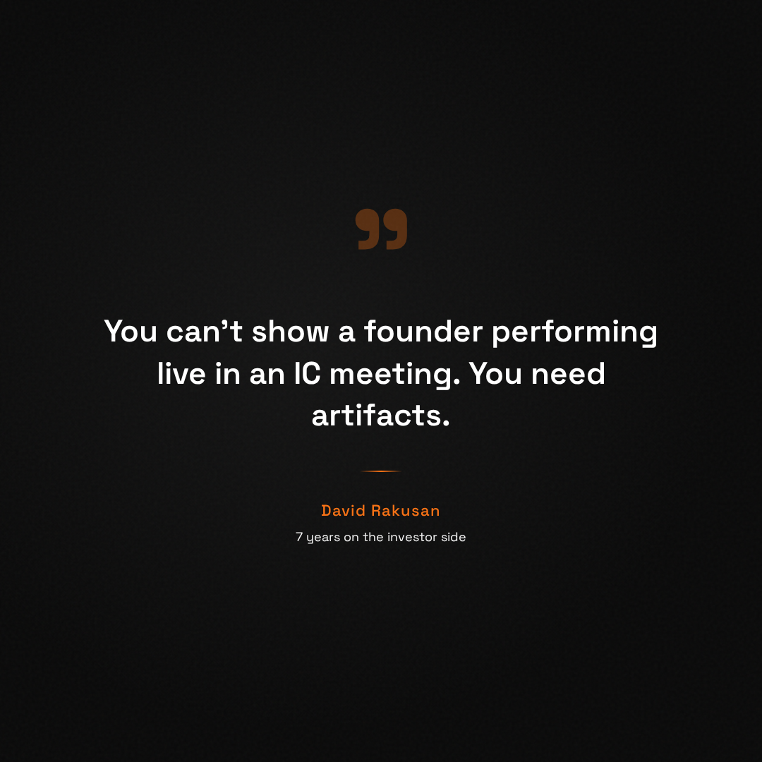 From 7 years of championing deals internally: what I always wanted was a demo I could show other partners, and proof I could point to. Real traction numbers, because those are hard to fake. Founder pedigree: serial entrepreneur, respected researcher, speaking at conferences that are hard to get into. Anything that backs up the claim "this founder is great" without needing the founder in the room. You cannot show a founder performing live in an IC meeting. You need artifacts. The founders who gave me those artifacts made my job easy. The ones who didn't left me arguing from memory.