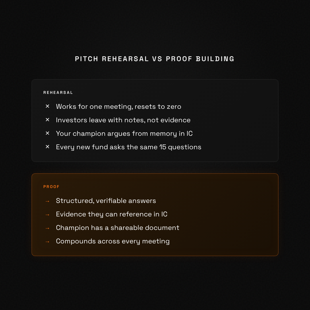 Both matter, but proof has far more leverage. Pitch rehearsal improves delivery in one meeting. A structured proof document works across every meeting with every fund. It gives your internal champion at each firm something concrete to share with partners who never met you. Investors increasingly use AI and structured data in their workflows, so proof formatted for asynchronous review has a compounding advantage.