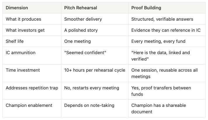 Rehearsal helps you perform better in one meeting. Proof compounds across all of them. The best founders do both, but they spend 80% of their prep time on proof and 20% on delivery.